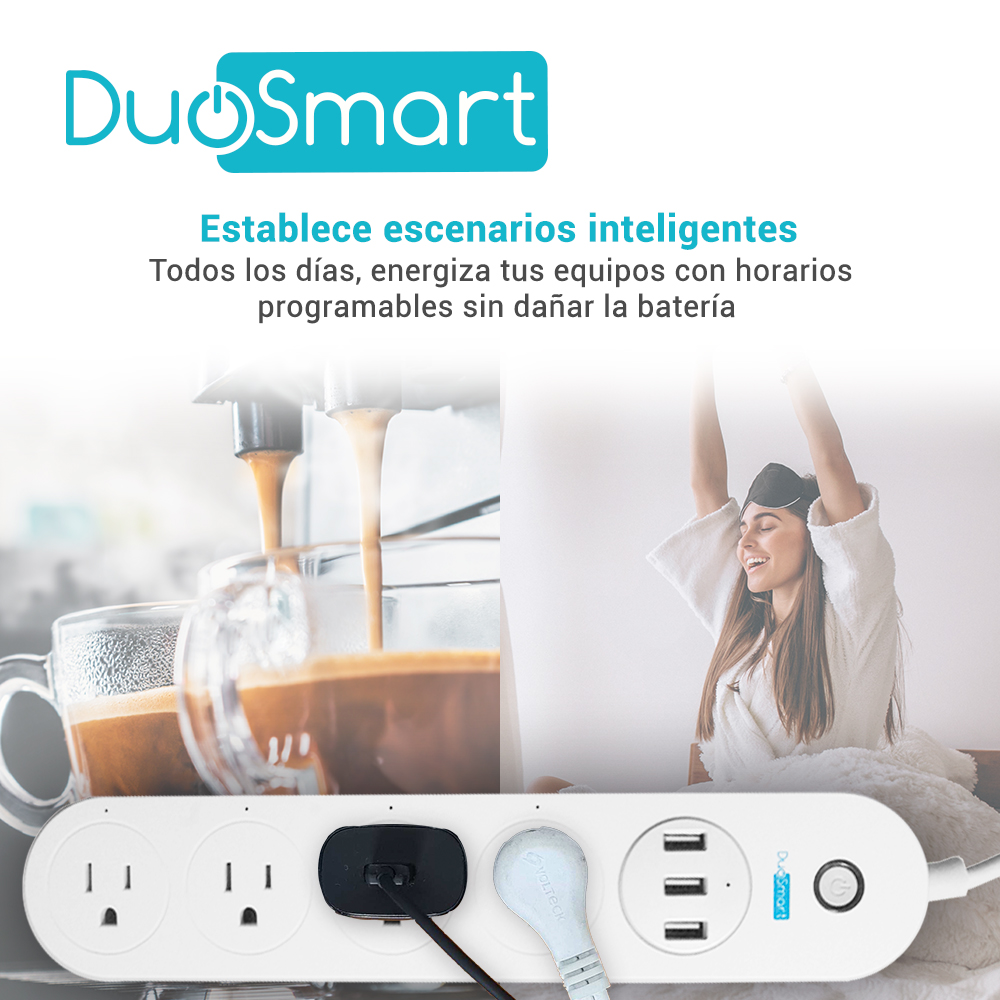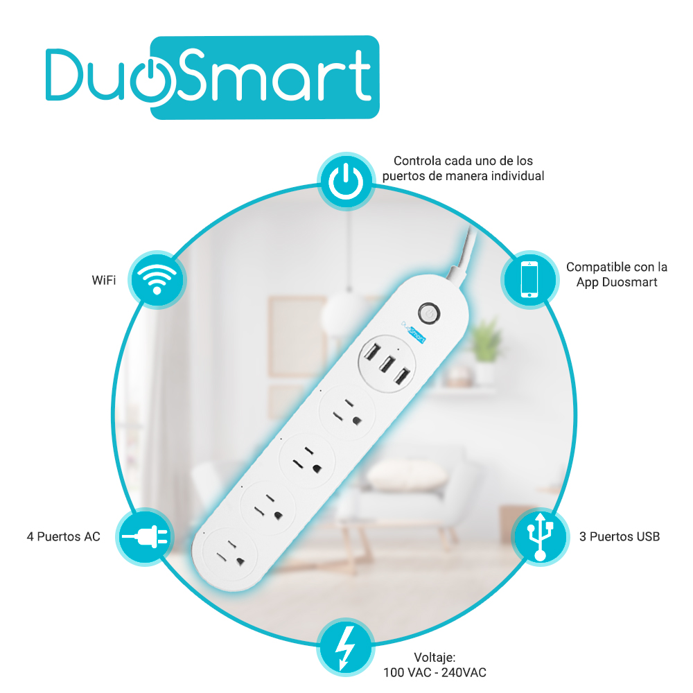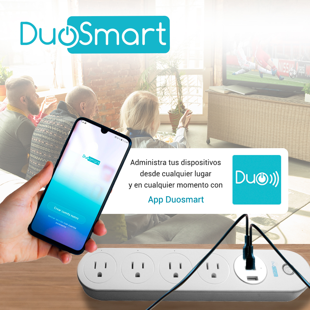 BARRA MULTICONTACTO WIFI DUOSMART B50 CON CONTROL INDEPENDIENTE DE CONTACTOS Y USB. La barra de multicontactos Duosmart B50, es un dispositivo que nos permite adentrarnos en el mundo de la automatización. Maneja este dispositivo desde la palma de tu mano, con la aplicación móvil de Duosmart, administra tus contactos de manera independiente(excepto los puertos USB, se encienden o apagan los 3 al mismo tiempo), tú decides cuando encenderlos o apagarlos . Además podrás crear escenas que ayudarán a determinar en que momento accionar los contactos, como por ejemplo: Programa una hora de encendido y apagado, para automatizar tus equipos que requieren carga periódica de energía, ya no más baterias de celular dañadas por dejarla conectada toda la noche. Apaga tus equipos sin desconectarlos fisicamente. Su diseño con contactos en forma horizontal te permitirán colocar diferentes tipos de fuentes y adaptadores sin tener que preocuparse por el espacio de los contactos, además de contar con un cable de alimentación de 2 mts de largo, lo cual facilitará su instalación. No cuenta con orificios para montaje en pared, se puede colocar utilizando cinta doble cara.