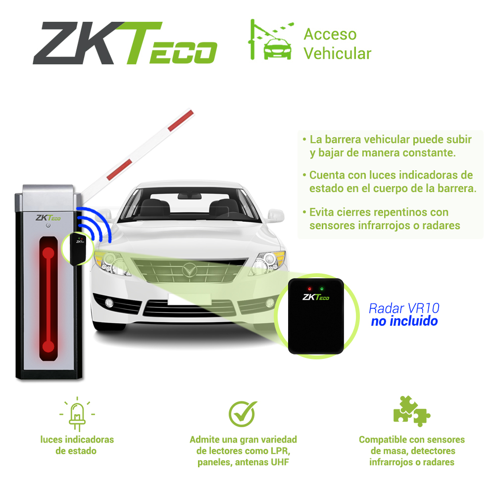 BARRERA VEHICULAR ZKTECO CMP300L CON BRAZO TELESCOPICO RECTO SENTIDO IZQUIERDO VELOCIDAD DE CIERRE 3 SEGUNDOS ALIMENTACION ELECTRICA 110VCA APERTURA MANUAL EN CASO DE FALLA ELECTRICA COMPATIBLE CON PANELES DE ACCESO, ANTENAS VEHICULARES Y CAMARAS LPR