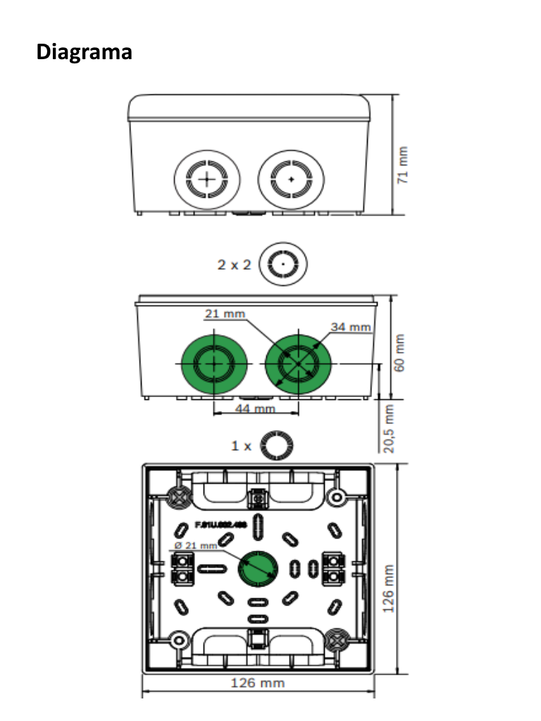 - La carcasa para montaje en superficie tiene dos conductos para cables en las caras opuestas: - 2 x 2 conductos para cables pretaladrados para un diámetro de hasta 21 mm/34 mm (para tubos) - 2 x 4 manguitos de goma con diámetros de hasta 8 mm.