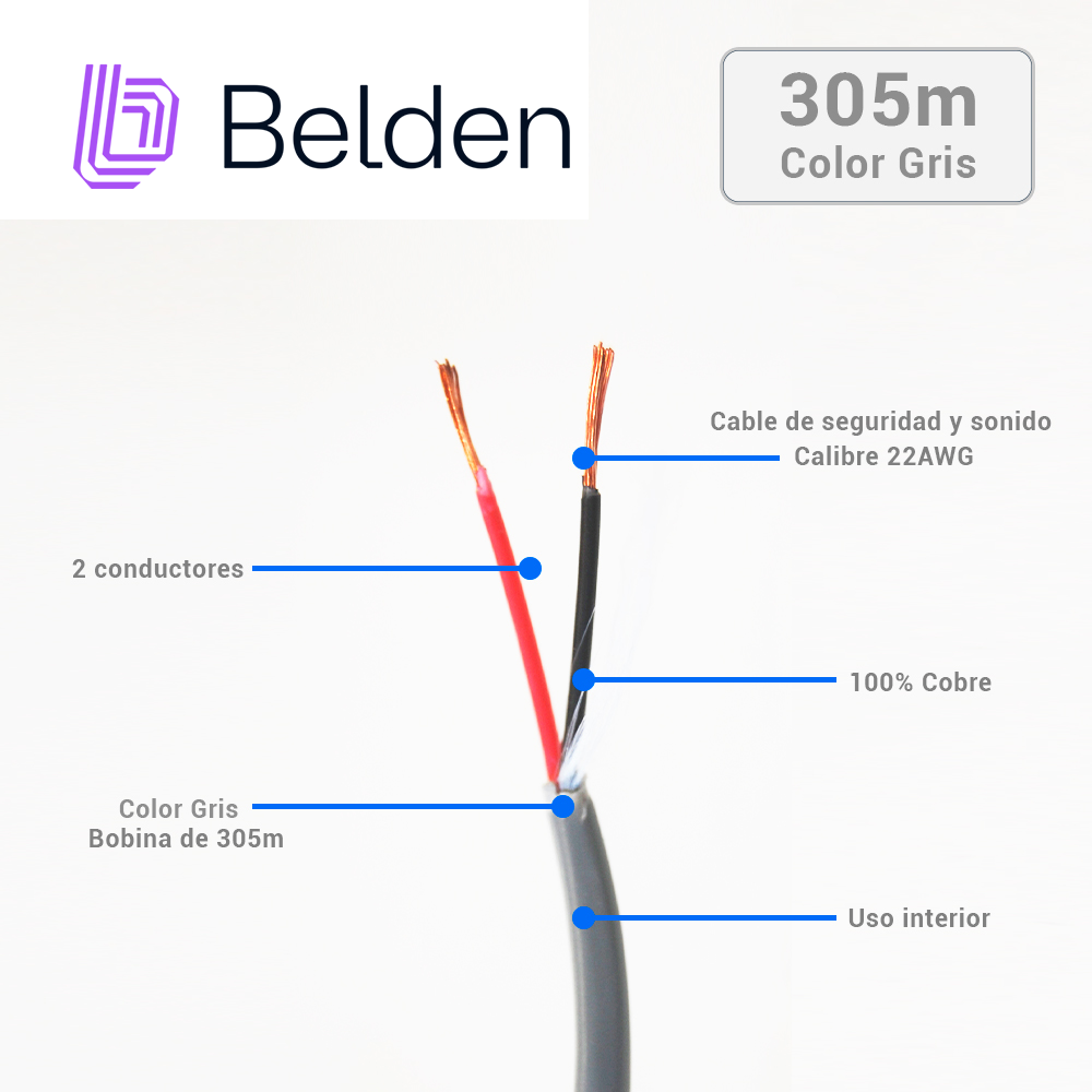 CABLE DE SEGURIDAD Y SONIDO BELDEN 5500UE 0081000 / INTERIOR / GRIS / 2 CONDUCTORES / 22 AWG / MULTIFILAR / FORRO PVC / CMR / BOBINA / 1,000 PIES 305 METROS