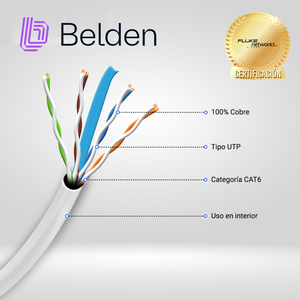 BELDEN 2412 009A1000 Cable UTP BELDEN Categoria 6 (350 Mhz) Bobina de1000ft o 305 metros. Conductor de cobre calibre 23AWG. Para uso en interior Ideal para cableado horizontal de datos voz y video. Ideal para redes de 1000 Mbps. Color Blanco 100% cobre Conductor tipo solido