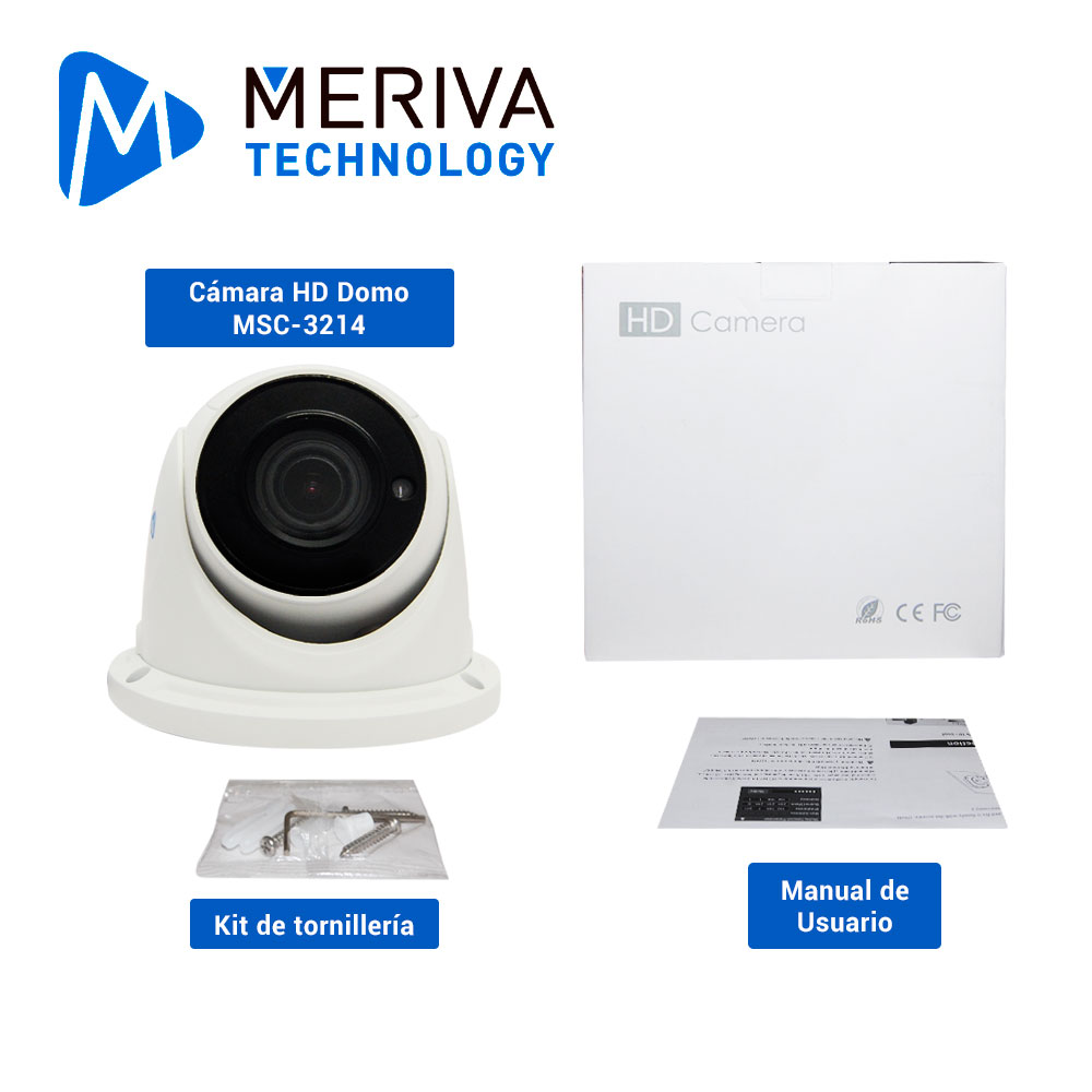 CÁMARA HD TURRET MERIVA TECHNOLOGY MSDC-3214 / 2 MP / 4 EN 1 (AHD/TVI/CVI/CVBS) La cámara turret MSC-3214 es una cámara 1080P (2MP) con lente varifocal. La cámara es adecuada para las escenas que requieren visualización de imágenes de alta definición, como finanzas, telecomunicaciones, gobierno, escuelas, tiendas, aeropuertos, fábricas, hoteles, etc. Infrarrojos con alcancé de hasta 50 metros, menú OSD y funciones de video como reducción de ruido, balance automático de blancos, control de ganancia automático y un housing con protección IP67. Características principales: Resolución HD 1080P (2MP) Alta resolución HD (1080 x 1920). Lente varifocal 2.8 ~12mm. Multi Tecnología AHD / CVI / TVI / CVBS Soporta menú OSD por CoC (Con botón) Montaje en techo o pared. Norma IP67, Totalmente protegido contra el polvoy arena, Protegido contra fuertes chorros de agua, para uso en cubiertas de barcos. Posible penetración limitada. Distancia de IR: 30 ~ 50 metros Carcasa metálica