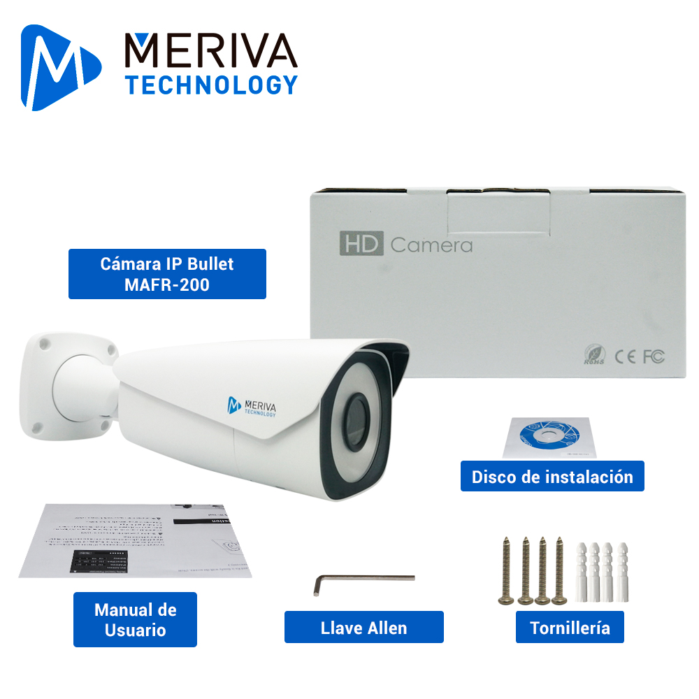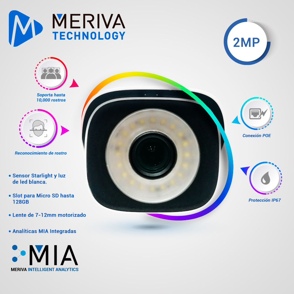 MERIVA TECHNOLOGY - VIDEO IP - BULLET- MAFR-200 - RECONOCIMEINTO FACIAL STANDALONE La cámara Bullet Meriva MAFR-200 está diseñada para soluciones de Video IP que requieren de la inteligencia artificial para el reconocimiento facial sin necesidad de un NVR y sin licencia para su funcionamiento. Cumple con el protocolo TCP/IP, UDP, RTSP, etc., para asegurar que el sistema sea más estable y fiable. Gracias a su conexión POE y tecnología CIP, con un lente motorizado y leds poderosos de luz blanca para cumplir el objetivo de reconocimiento facial. Características principales: Resolución 2 MP (1920 x 1080) @ 30 fps. Códec de compresión H.265 / H.265 / H.264 / H.264. Día / Noche automático ICR. Visualización nocturna 10 m luz blanca. Funciones integradas como Real WDR 120 dB, 3DNR, HLC, BLC entre otras. Soporta triple streaming. Entrada / Salida de audio 3.5 mm. Entrada / Salida de alarma. Soporta almacenamiento en Micro SD hasta 256 GB. Alimentación 12 VCD / PoE (802.3 af). Protección IP67. DDNS mymeriva.com gratuito. Conexión P2P Meriva Technology. Analíticos con inteligencia artificial. Compatible con iOS y Android. Software NVMS 2.0 gratuito. Soporta Reset por botón.