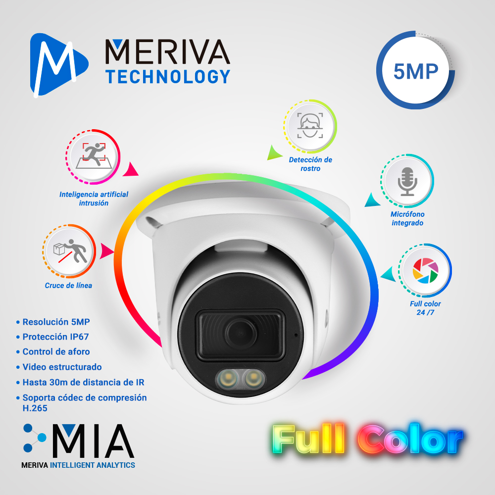 CAMARA IP TURRET MERIVA TECHNOLOGY MTD-FC500FA / 5MP / H.265+ / 2.8MM / 20 - 30M LUZ CALIDA / IP67 / METALICA / 12 VCD / POE / SOPORTA MICRO SD HASTA 256 GB (NO INCLUIDA) / 1 ENTRADA DE AUDIO / MICROFONO INTEGRADO / MIA 2.0 / ONVIF / FACE - DETECCION - CONTROL DE AFORO - VIDEO ESTRUCTURADO - INTRUSION - CONTEO DE PERSONAS - ENTRADA-SALIDA DE AREA / REAL SCENE SERIES - IMAGEN A COLOR 24/7 / COMPATIBLE CON NVR MERIVA SERIE MAIN PARA RECONOCIMIENTO FACIAL