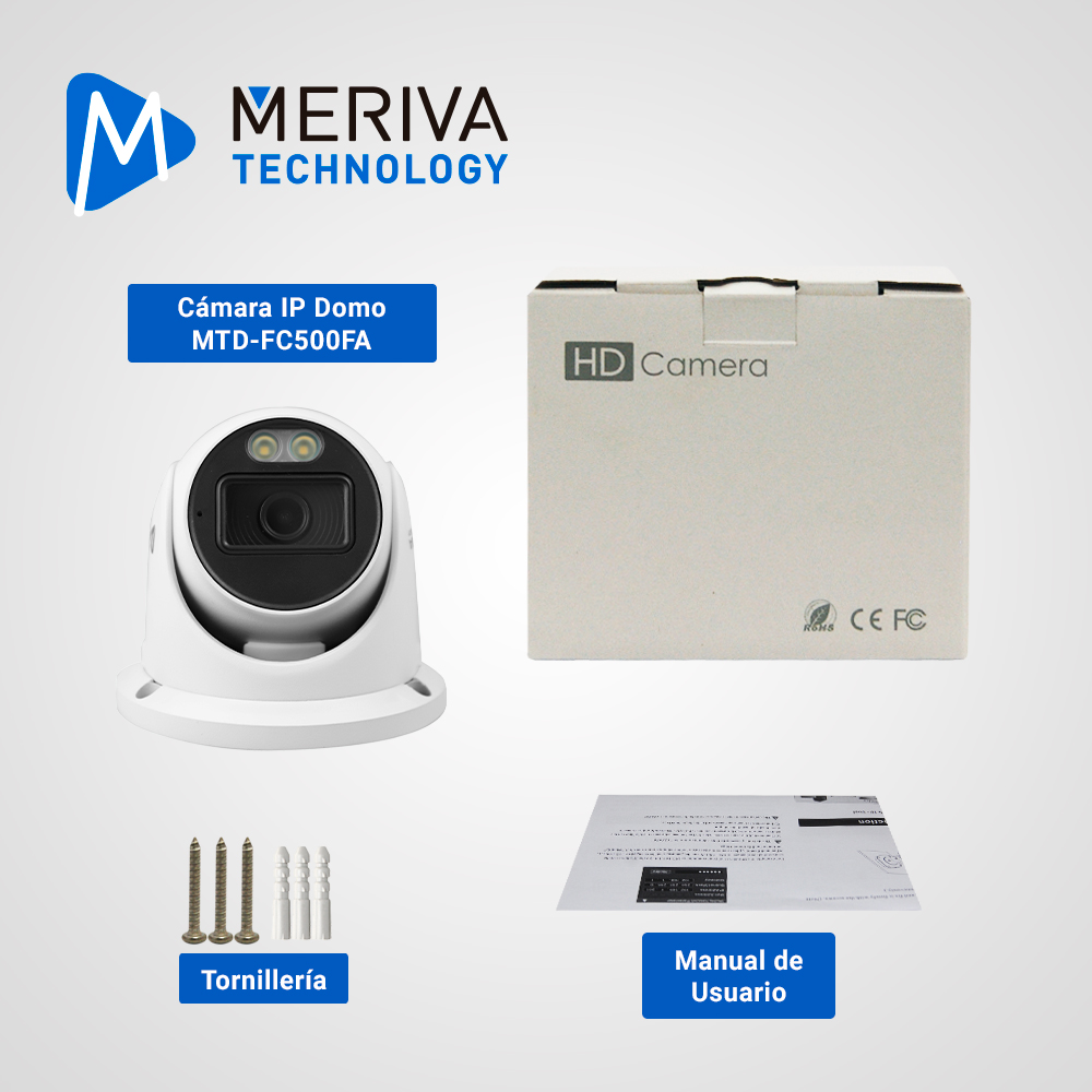 CÁMARA IP DOMO MERIVA TECHNOLOGY MTD-FC500FA / 5 MP / SERIE FULL COLOR / MICROFONO INTEGRADO La cámara MTD-FC500FA está diseñada para soluciones profesionales de Video IP.Cumple con el protocolo TCP/IP, UDP, RTSP, etc., para asegurar que el sistema sea más estable y fiable. Gracias a su conexión POE y tecnología CIP, el proceso de instalación se reduce a 1 sólo paso, "conecta tus cámaras a tu NVR", sin necesidad de configuraciones complicadas. La cámara cuenta con un sensor Full Color, lo cual muestra imágenes a color 24x7.