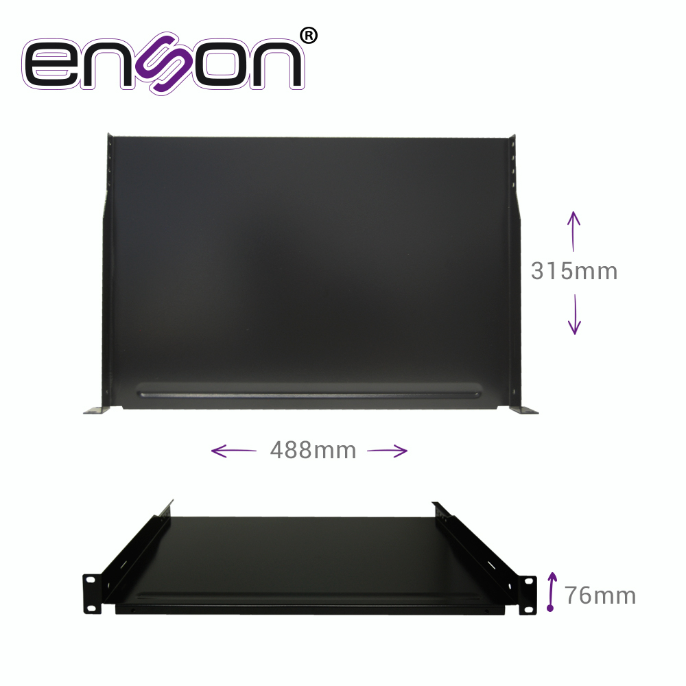 ENS-RTR1U ENSON Charola de fijación lateral ENSON. Ocupa 1 UR. Soporta hasta 15Kg. de carga. Dimensiones 488x76x315 (ancho x alto x profundidad).