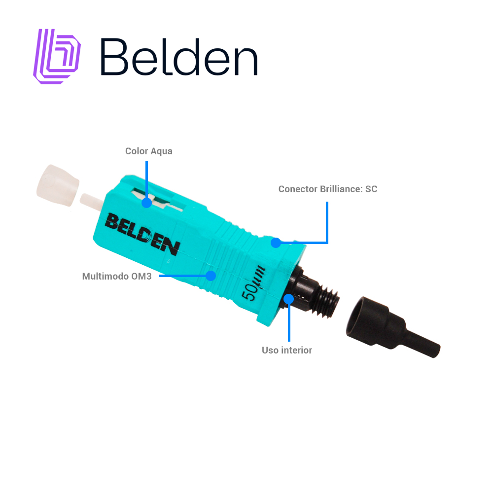 AX105207-S1 BELDENFX Brilliance Universal SC Conector instalable en campo, Multimodo, OM3-OM4, Aqua Housing, 1 / Paquete, con soporte para 250 micras (con kit de desprendimiento), 900 micras, 2 mm y 3 mm de fibra (con botas encamisadas). Incluye una funda de 900 micras, otros accesorios (kit de desprendimiento y botas con camisa) que se venden por separado. Tipo de fibra Multimodo OM3 Tipo de conector SC Pérdida máxima de inserción: 0.50 dB Pérdida de inserción típica: 0.20 dB Reflectancia mínima a 1550nm: -30 dB Estilo de terminación: Mecánico Compatibilidad de interconexión: Cumple con TIA / EIA-604-3