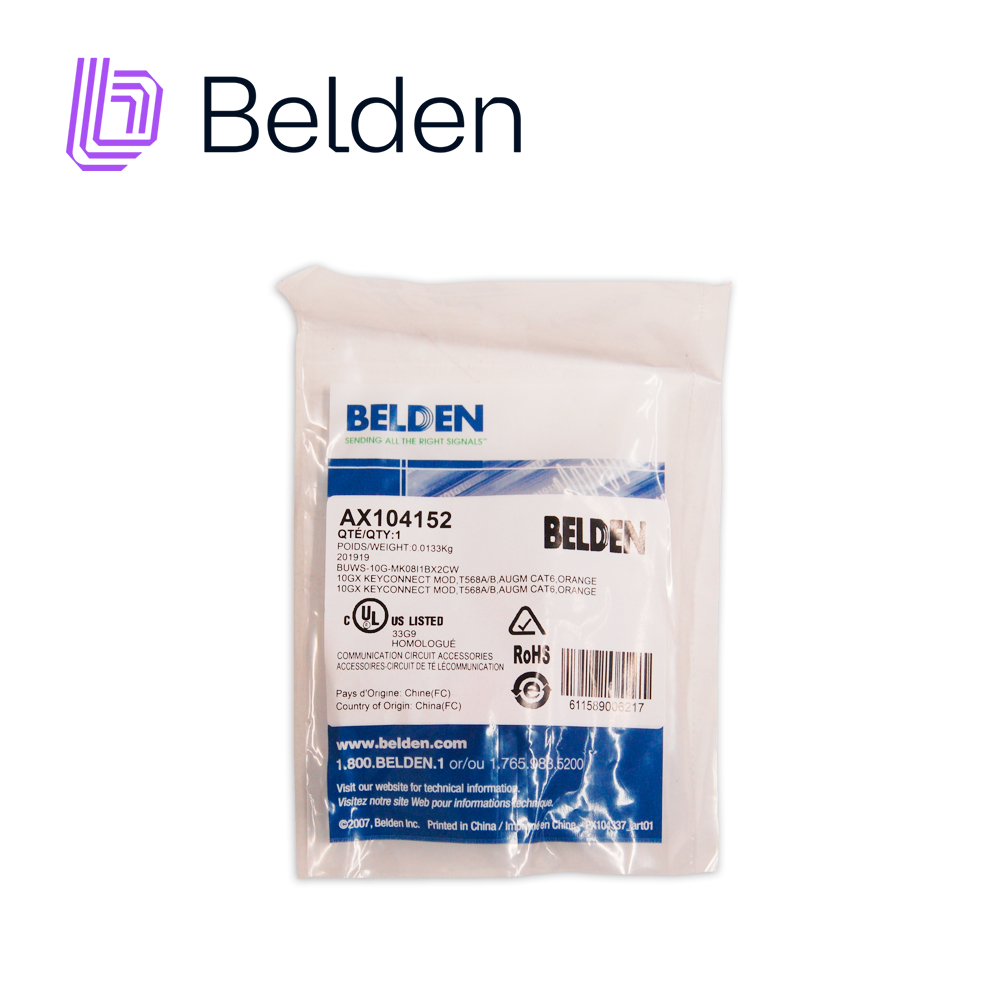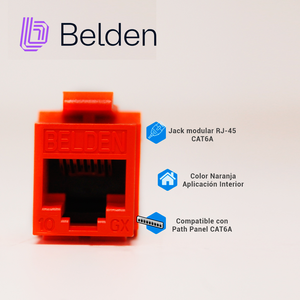 CONECTOR MODULAR JACK RJ45 CAT6A BELDEN AX104152 ESTILO KEYCONNECT NARANJA COMPATIBLE CON FACEPLATE AX102660,AX102655,AX102249 PATCH PANEL MODULAR AX103114,AX103115,AX104599 ESQUEMA DE CABLEADO T568A/B HERRAMIENTA COMPATIBLE AX100749 USO INTERIOR CALIBRE DEL CONDUCTOR 22-24 AWG