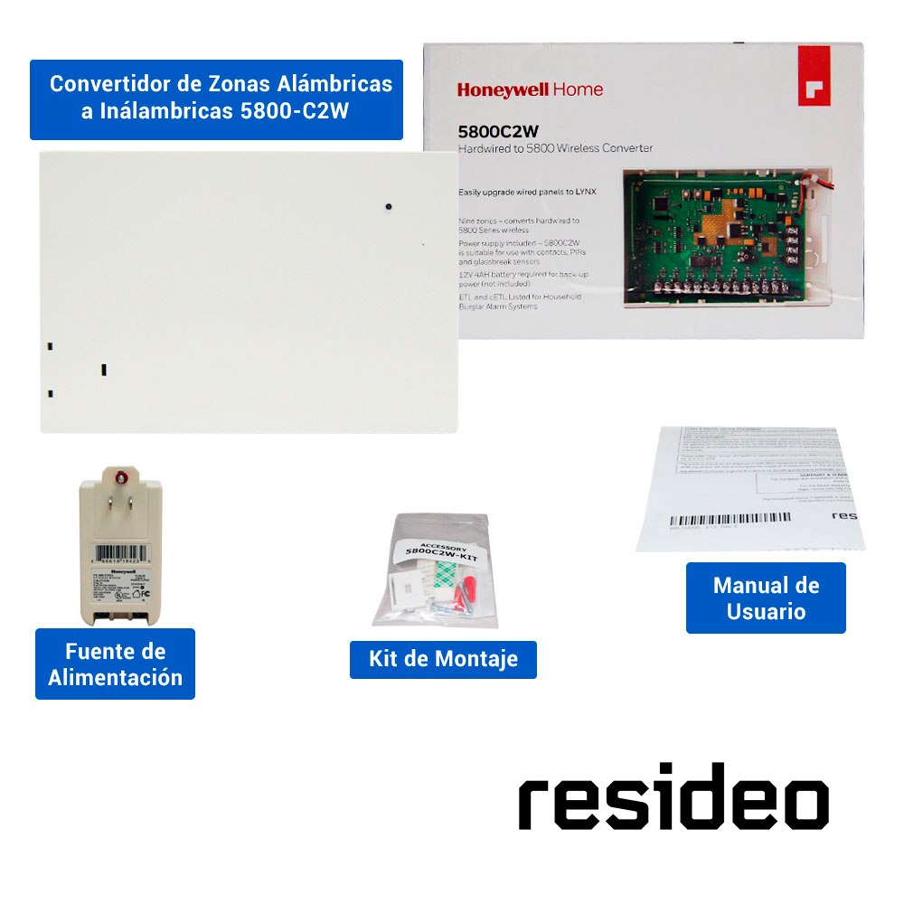 CONVERTIDOR DE ZONAS ALAMBRICAS A INALAMBRICAS HONEYWELL 5800-C2W El convertidor permite modernizar los sistemas de seguridad de 12 voltios existentes al convertir sus sensores cableados a la tecnología inalámbrica Honeywell Home 5800 Series. Sus usos ideales son actualizar los sistemas cableados a los sistemas LYNX Touch para proporcionar funcionalidad doméstica y comercial conectada, o actualizar a LYNX Plus para la seguridad tradicional. Además, se puede utilizar en instalaciones de nueva construcción que hayan sido equipadas con sistemas cableados. La conversión de zonas cableadas existentes en inalámbricas ahorra costos de instalación, tiempo y materiales, ya que no es necesario reemplazar los dispositivos cableados con transmisores individuales. Honeywell Home 5800C2W es fácil de instalar y extremadamente flexible. Puede alimentar PIR con cable, y la fuente de alimentación incluida está respaldada por una batería recargable estándar. La calibración con un botón configura automáticamente el 5800C2W al saber qué zonas están en uso. La configuración es un proceso de tres pasos: Monte y cablee el móduloCalibrar / activar las zonas del móduloInscriba las zonas inalámbricas del módulo en el panel de control
