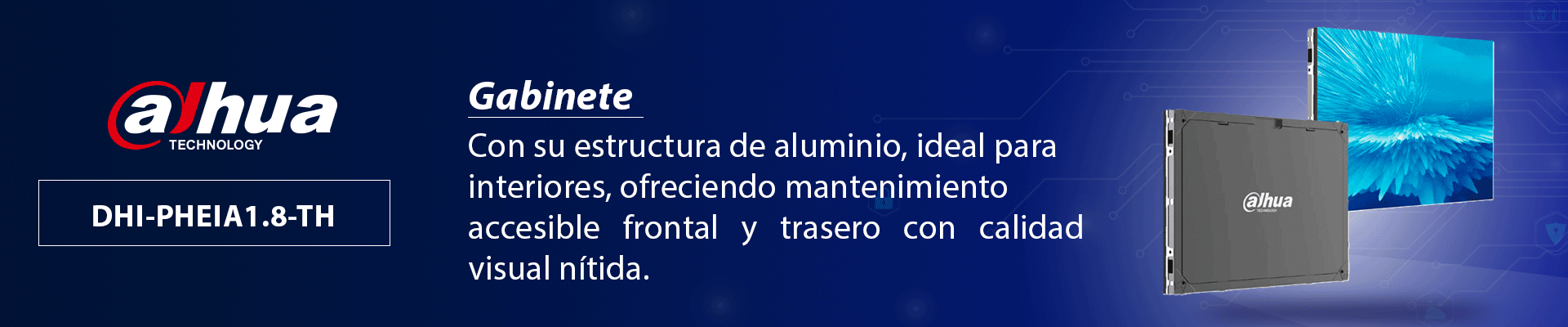 El DAHUA DHI-PHEIA1.8-TH es un gabinete LED Pitch 1.8 ideal para instalaciones en interiores, que proporciona una experiencia visual de alta calidad. Su diseño robusto con estructura de aluminio garantiza una durabilidad excepcional, mientras que su capacidad de mantenimiento frontal y trasero permite una fácil accesibilidad para la instalación y el servicio. Con unas dimensiones de 640x480 mm, se adapta perfectamente a diferentes espacios interiores, ofreciendo un rendimiento fiable y una visualización nítida. Este modelo es ideal para centros comerciales, salas de conferencias, y otros entornos que requieren soluciones de visualización LED de alta calidad.