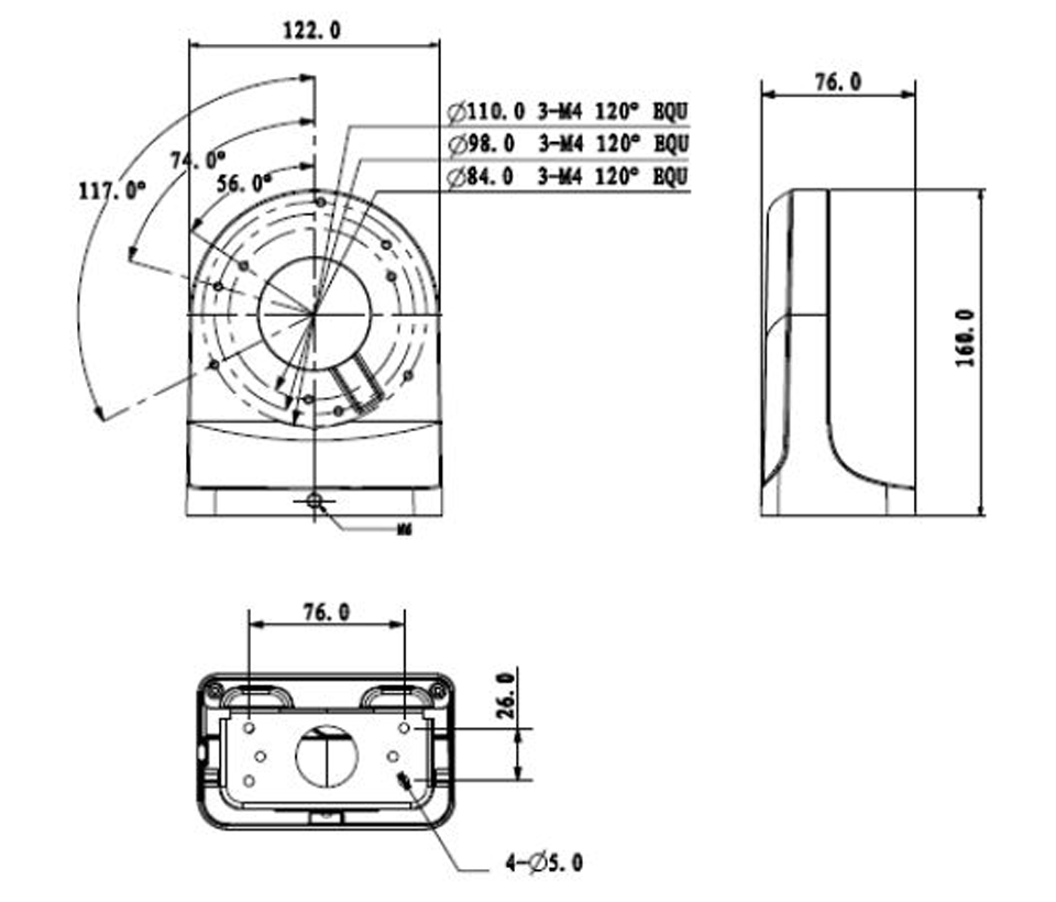 El PFB203W es un brazo de pared para cámaras domo de la marca Dahua, el brazo está construido de un material de aluminio el cual le permite soportar hasta 1Kg de peso, sus medidas: 160 x 122 x 76mm.