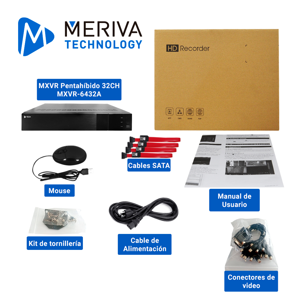 DVR MERIVA TECHNOLOGY MXVR-6432A HD H.265 40 CANALES 5 MP PENTA HIBRIDO 32 CH BNC / 8 CH IP / SOPORTA AUDIO POR COAXIAL (SOLO POR TVI) / 1 CH ANALOGO CON INTELIGENCIA ARTIFICIAL El MXVR-6432A es un DVR Penta híbrido que soporta los formatos de video AHD, TVI, CVI y análogo en sus 32 canales BNC con una resolución de hasta 5 MP@20 fps y 8 canales IP de hasta 5 MP@30 fps en red, todo en un mismo equipo para obtener la máxima compatibilidad y resolución. El equipo adapta el formato de compresión de alto perfil H.265 en todos sus canales para garantizar la grabación en tiempo real y con mayor almacenamiento de información. Soporta audio por coaxial en todos sus canales BNC y un 1 CH BNC con analítica MIA 2.0 Cruce de línea e Intrusión (Humano/Vehículo). Caracteristicas: Soporta 32 CH BNC (TVI / AHD / CVI / CVBS) 5 MP (Excepto en CVI) / 4 MP / 3 MP / 2 MP / 1 MP / WD1. Soporta 8 CH IP 5 MP / 4 MP / 3 MP / 2 MP / 1 MP. Permite cambiar 16 CH BNC a 16 CH IP teniendo un máximo de 24 CH IP. Grabación de 5 MP Lite. Cuenta con interfaz gráfica de usuario intuitiva y amigable. Estándar H.265 . Múltiples modos de grabación: manual / programada / movimiento / sensor / inteligencia. Reproducción: 16 CH simultáneos. Soporta preset y crucero en PTZ, hasta 255 presets y 8 cruceros. Soporta visualización remota por NAT. Función de inteligencia artificial basada en protección perimetral (Solo 1 CH análogo BNC). Entradas y salidas de alarma. Entradas y salidas de audio. Soporta Audio sobre Coaxial (AOC) (Únicamente por TVI). Soporta 4 HDD SATA de hasta 10 TB c/u, 1 E-SATA. Salida HDMI / VGA Full HD, BNC CVBS. Cuenta con puerto RS485 para control PTZ. Alimentación 110 VCA (Fuente interna ATX-250 W). Función de Audio por Coaxial: El término AOC (audio sobre coaxial) se refiere a una conexión de audio que utiliza un cable coaxial para transmitir la señal de audio entre dispositivos, como cámaras de video y grabadores "DVR". Como tal el AOC (audio sobre coaxial) la transmisión simultánea de la señal de video y de audio viajan a través de un solo cable. Esto significa que no se requiere un cable adicional o una conexión separada para transmitir el audio. Para poder usar el audio a traves del cable coaxial, es necesario contar con equipos compatibles que admitan esta función.