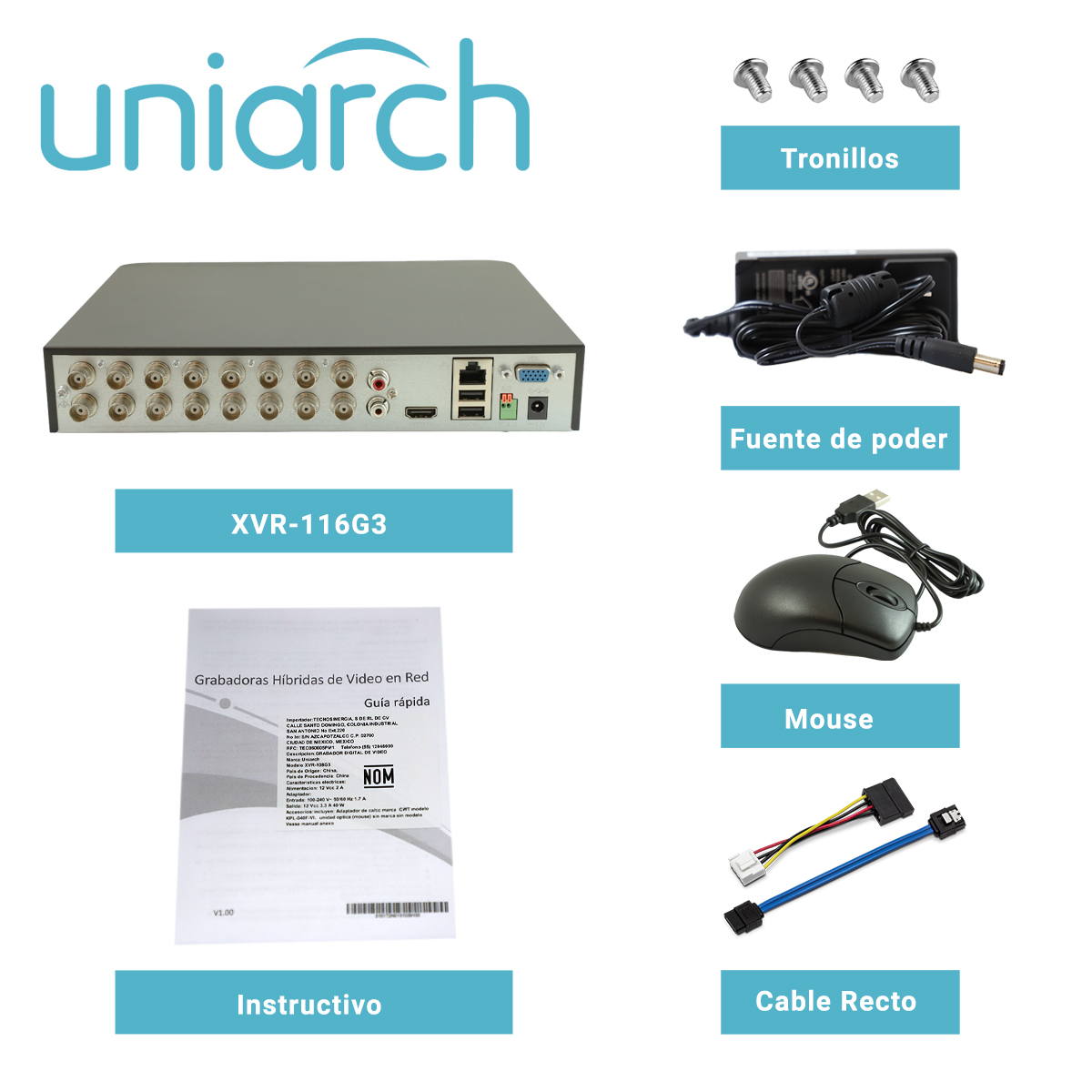 DVR PENTAHIBRIDO UNIARCH XVR-116G3 / 16 CANALES ANALOGICOS (HASTA 5MP LITE A 12 FPS) / AHD / TVI / CVI / 8 CANALES IP (HASTA 8 MP) / CAPACIDAD DE 1 DISCO DURO DE 8 TB/ AUDIO ENTRADA/SALIDA / SALIDA VGA/HDMI SIMULTANEA / P2P (EZCLOUD) / ONVIF / RTSP / CARCASA METALICA