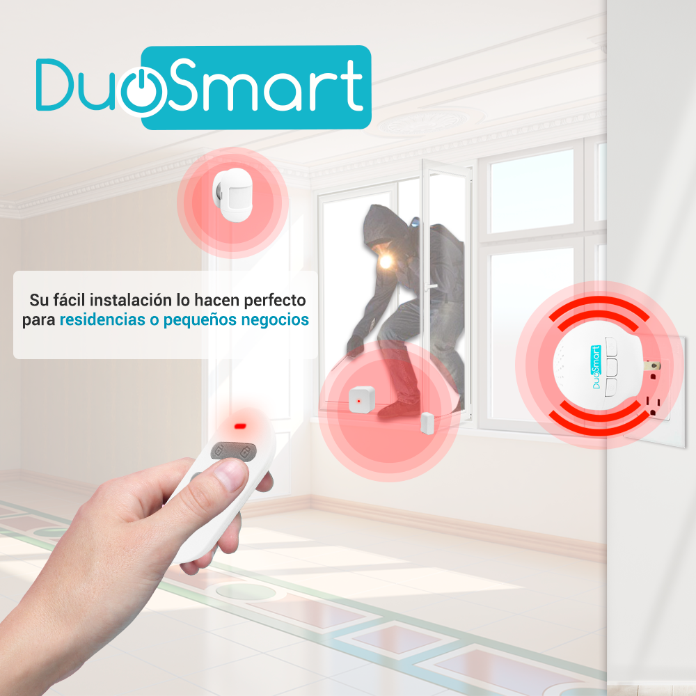 KIT ALARMA INALAMBRICA DUOSMART C20 C20 es un versátil sistema que te permite monitorear desde la aplicación el estado de la alarma. Tiene la habilidad de armar en modo total (Away) o parcial (home) para que tus dispositivos respondan diferente cuando estas en casa o cuando no hay nadie en el hogar brindando la seguridad que necesitas toda casa en este tiempo. Recibe en tu celular notificaciónes de eventos registrados en tu alarma. Puede monitorizar hasta 24 dispositivos totales. El Kit incluye un sensor magnético, un sensor de presencia y un control remoto. Puedes agregar un botón RF como timbre y seleccionar el tono musical así como el volumen. Compatible con WiFi 2.4 GHz (no acepta la banda de 5 GHz) para que te olvides de complicadas conexiones y puesta a punto. Conecta de manera tu nuevo C20 directo a un tomacorriente, los sensores usan baterías CR2450 Especificaciones WiFi 2.4GHz. Hasta 24 sensores Acepta armado modo Home y Away Compatible con APP Duosmart Compatible con sensores RF 433.92 Alimentación del C20 110 VCA Alimentación del sensor magnético batería de 3 VCD modelo CR2450 Alimentación del PIR batería de 3 VCD modelo CR2450 o mediante el conector micro USB de 5 VCD Batería del control remoto batería de 3 VCD modelo CR2032 **NO ES COMPATIBLE CON LA SIRENA INALAMBRICA CSIREN1**