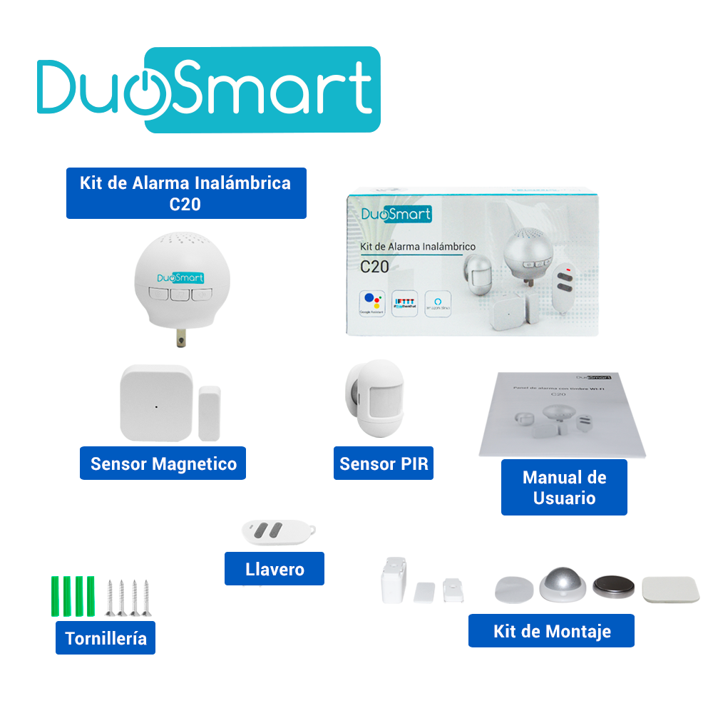 KIT ALARMA INALAMBRICA DUOSMART C20 COMUNICACION DUAL WIFI 2.4 GHZ RF 433.92 INCLUYE 1 PANEL 1 PIR 1 MAGNETO 1 LLAVERO **COMPATIBLE CON SENSORES DUOSMART C**