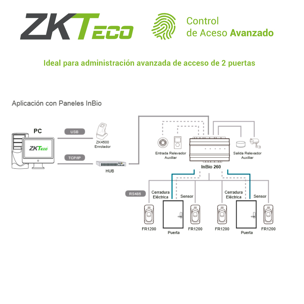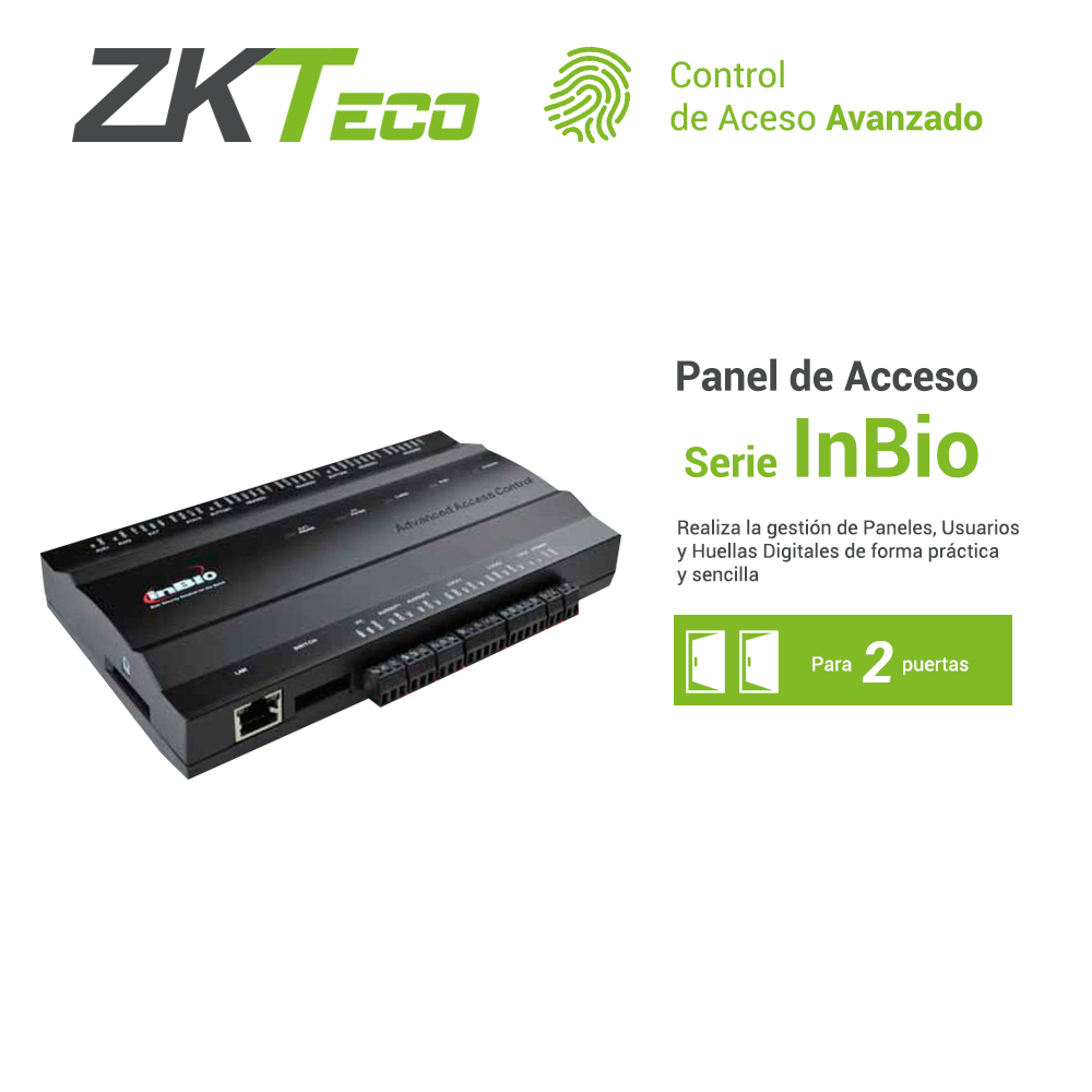 Panel de control de acceso avanzado TCP/IP para dos puertas inBio 260 La serie de paneles InBio es la línea de productos de seguridad más avanzada en la industria. Son los primeros controladores a nivel mundial en incorporar tecnología biométrica de identificación de huellas digitales de manera interna. La innovadora tecnología InBio permite al administrador del sistema realizar la gestión de paneles, usuarios y huellas digitales de la manera más práctica y sencilla posible. Los paneles, incluyen el software GRATUITO de administración ZKBio CVAccess el cual ofrece una amigable interfaz de usuario para realizar la configuración de parámetros, generar reportes de acceso, monitoreo de puertas en tiempo real entre otras múltiples funciones. Todos los paneles cuentan con interfaz de conexión TCP/IP y RS485 ofreciendo así un sistema versatil, fácilmente escalable. ¿Donde puedo descargar el Software? Da Clic en el siguiente enlace: https://zktecolatinoamerica.com/software/zkbio-cvaccess/ Capacidad:El sistema soporta hasta 3,000 plantillas de huellas digitales, 30,000 tarjetas y almacena hasta 10,000 eventos y transacciones.Controladores de puerta y otras funcionesAdemás de los relevadores para el control de las puertas, cuentan con entradas y salidas auxiliares fácilmente programables para control de luces, alarmas, detección de intrusos, vínculos o control manual.Opciones:La serie InBio cuenta con paneles de 1, 2 y 4 puertas para adaptarse a las necesidades del proyecto. Es posible combinar los diferentes paneles para reducir costos y optimizar los recursos, siendo gestionados mediante el mismo software de administración.Avanzado Control de Acceso Integrado:Cuentan con funciones avanzadas de control de acceso tales como anti-passback, verificación multi-usuario, huella y contraseña de coacción, vínculos con entradas y salidas auxiliares, entre otras.Para Desarrolladores de SoftwareSDK gratuito está disponible para integradores y OEMs para integrar el controlador InBio con sus aplicaciones de seguridad o administración de personal existentes. Si lo requiere, ZK puede personalizar InBio firmware para satisfacer cualquier requirimiento de los clientes.