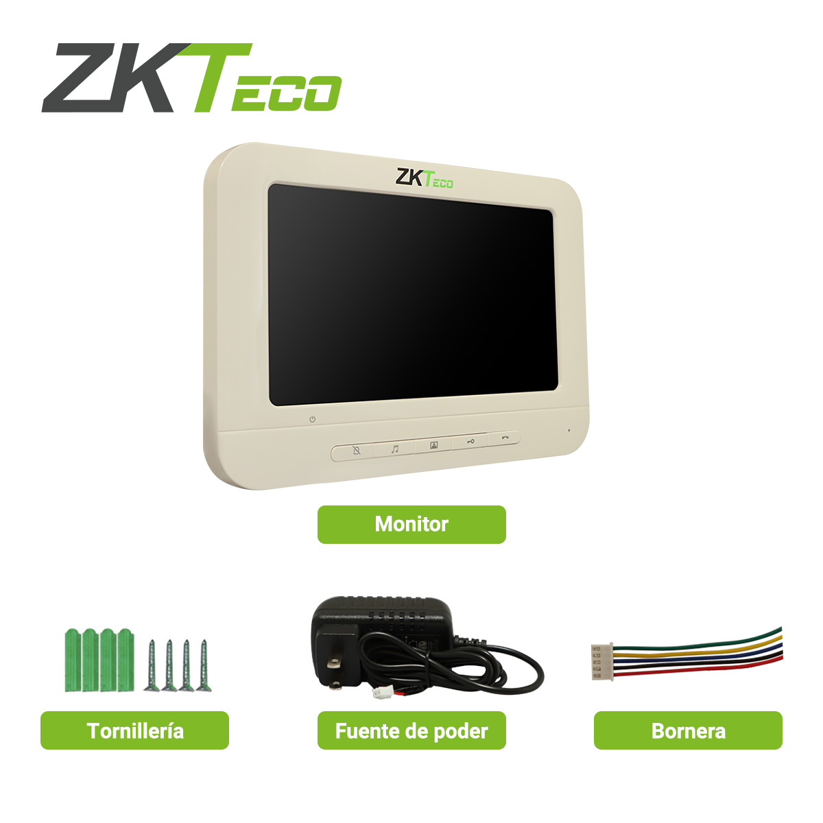 Pantalla adicional para sistema de videoportero ZKTeco Monitor únicamente exclusivo para videoporteros modelo VDPI-B3 de ZKTeco, no es compatible con otras marcas. Especificaciones: Pantalla: a color 7" Resolución: 800 x 480 px Energía: Entrada 110 VCA Energía: Salida 15 VCD 1.2A (para alimentar frente de calle) Consumo: 10W en operación, 1W en reposo Cableado: 4 hilos calibre 22AWG Distancia máx: 100m