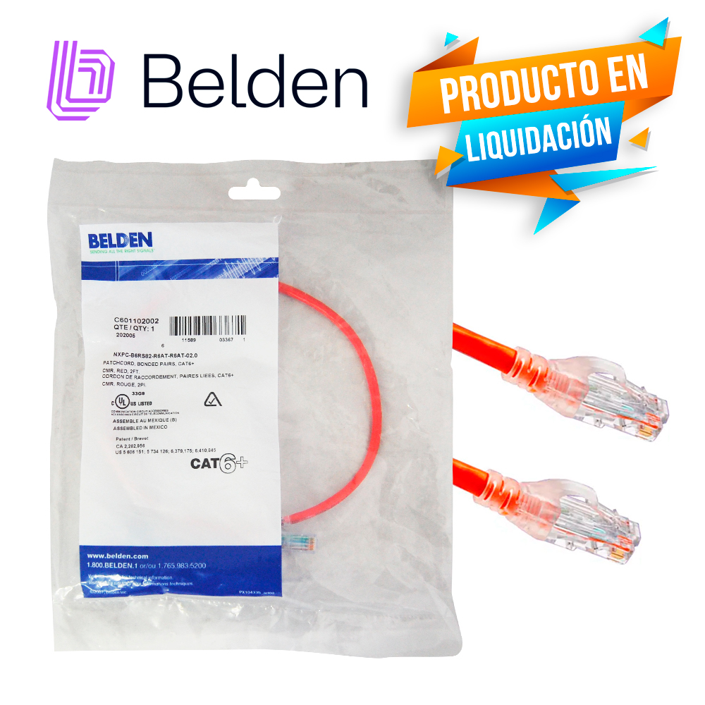 C601102002 BELDENPatch cord 4 pares 24 awg, CMR, color rojo 2 ft (0.6m) Aplicaciones adecuadas: IBDN System 4800, IBDN System 3600, IBDN System 2400, TIA Categoría 6, ISO Clase E, 1000BASE-T Partes relacionadas: conectores modulares CAT6 , acopladores CAT6 RJ45, paneles de conexión CAT6 Esquema de cableado: T568A / B-T568A / B Embalaje: empaquetado individualmente en una bolsa de plástico transparente. Jack Compatibilidad: RJ45 Categoria:6 Color rojo 2 ft (0.6 m)