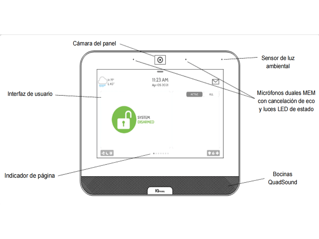 El IQ Panel 4 redefine la experiencia de audio en sistemas de seguridad con una mejora radical en su hardware: ahora integra 4 altavoces de 4 vatios cada uno, ubicados estratégicamente en la parte inferior de la pantalla táctil. Esta evolución es significativa frente al modelo anterior (IQ Panel 2 Plus), que solo contaba con 2 altavoces de 1 vatio. Gracias a esta potencia y claridad de sonido superior, el panel no solo emite alertas más fuertes, sino que también ofrece la versatilidad de utilizarse como un altavoz Bluetooth de alta fidelidad para reproducir tu música favorita.