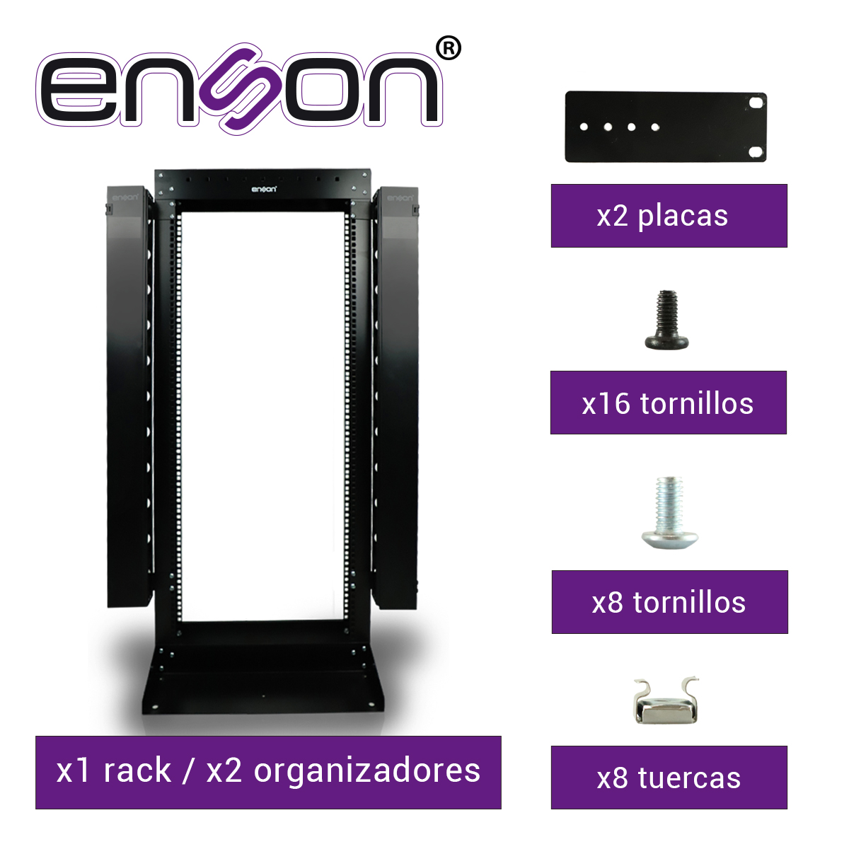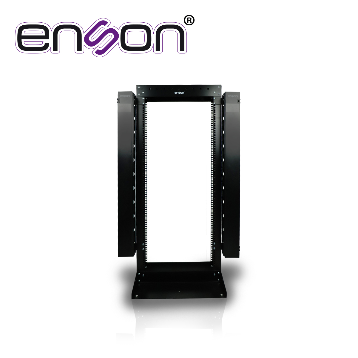 RACK VERTICAL ENSON ENS-RACK25UO DE 25UR DOS POSTES ORGANIZADOR VERTICAL INCUIDO EMPOTRABLE IDEAL PARA MONTAJE DE EQUIPOS DE RED Y CABLEADO ESTRUCTURADO, COMPATIBLE CON TODOS LOS ACCESORIOS DE RACKS Y GABINETES ENSON
