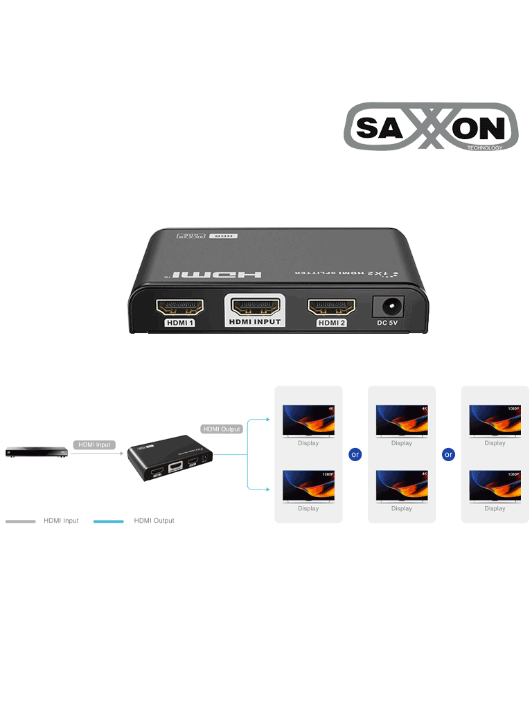 El divisor o splitter HDMI de Saxxon con amplificador de señal, 2 salidas, te permitirá enviar audio y video digital a dos pantallas al mismo tiempo desde una sola fuente, ya sea de un Blu-Ray, DVD, consola de videojuegos o un decodificador satelital o de cable.