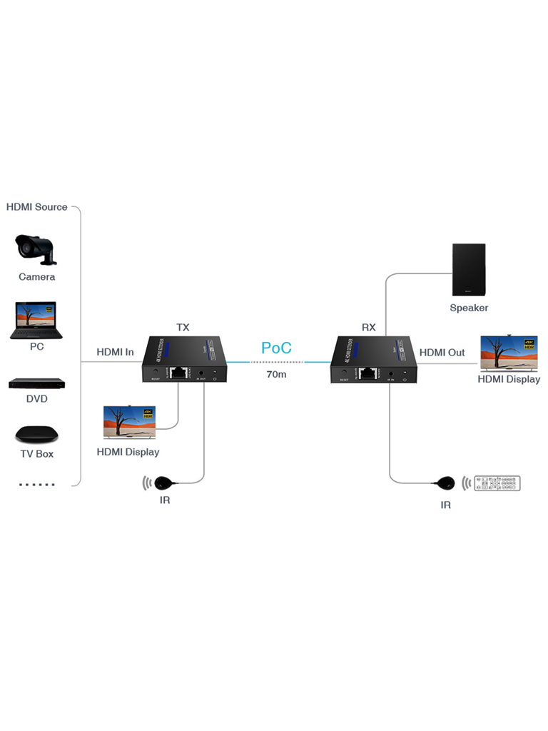 Este es un kit extensor de punto a punto HDMI, puede realizar una transmisión de latencia cero. La señal HDMI de 4K a 60 Hz se puede extender 70 m a través de un cable de red CAT6/6A/7. Es compatible con HDMI, loop out, paso IR, salida de audio de 3,5 mm, etc. Este kit es una solución confiable de transmisión de video de ultraalta definición, que se usa ampliamente en monitoreo de seguridad, cine en casa, transmisión, capacitación y otros campos.