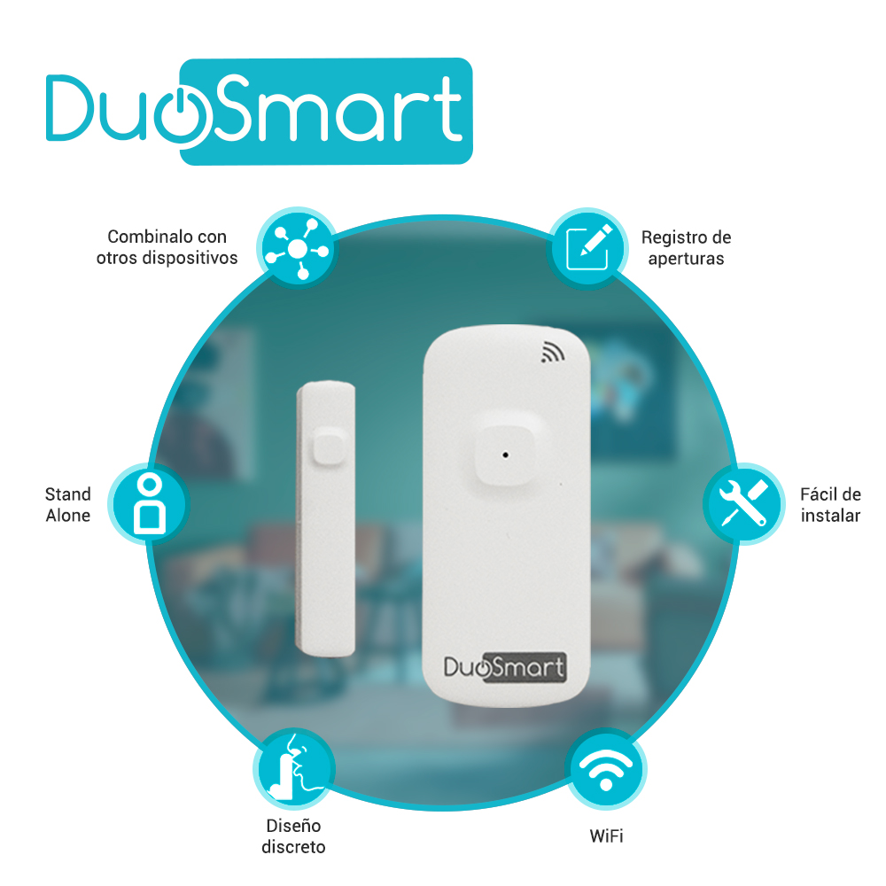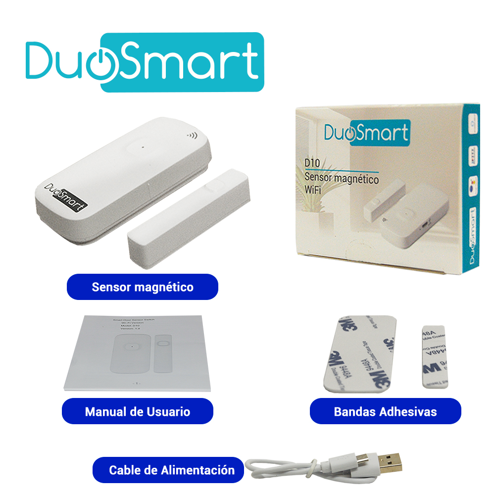 Sensor magnético inteligente WiFi Duosmart D10 Para saber si una puerta o ventana está abierta o cerrada, se requiere un contacto magnético que normalmente le reporta a un panel de alarma y no en todos los casos nos favorece el costo - beneficio de esa solución D10 es un contacto con batería recargable que al tener conectividad WiFi, puede notificar directamente a tu teléfono con ayuda de la aplicación Duosmart y a partir de allí enterate en todo momento cuando la puerta o ventana ha sido abierta o cerrada. Genera escenas de automatización en conjunto con otros dispositivos de la marca y has que cuando llegues a casa se enciendan los aparatos según tus gustos. Compatible con asistentes virtuales. Características Comunicación WiFi 2.4 GHz (no acepta banda 5 GHz) Batería recargable de 3.7 VCD a 500mAh Botón fisico de encendido y apagado Medición de la batería en la App Historial de cambios de estado Compatible con Alexa® y Google Home® Incluye cable de carga No incluye cargador