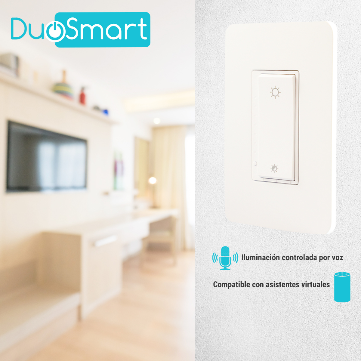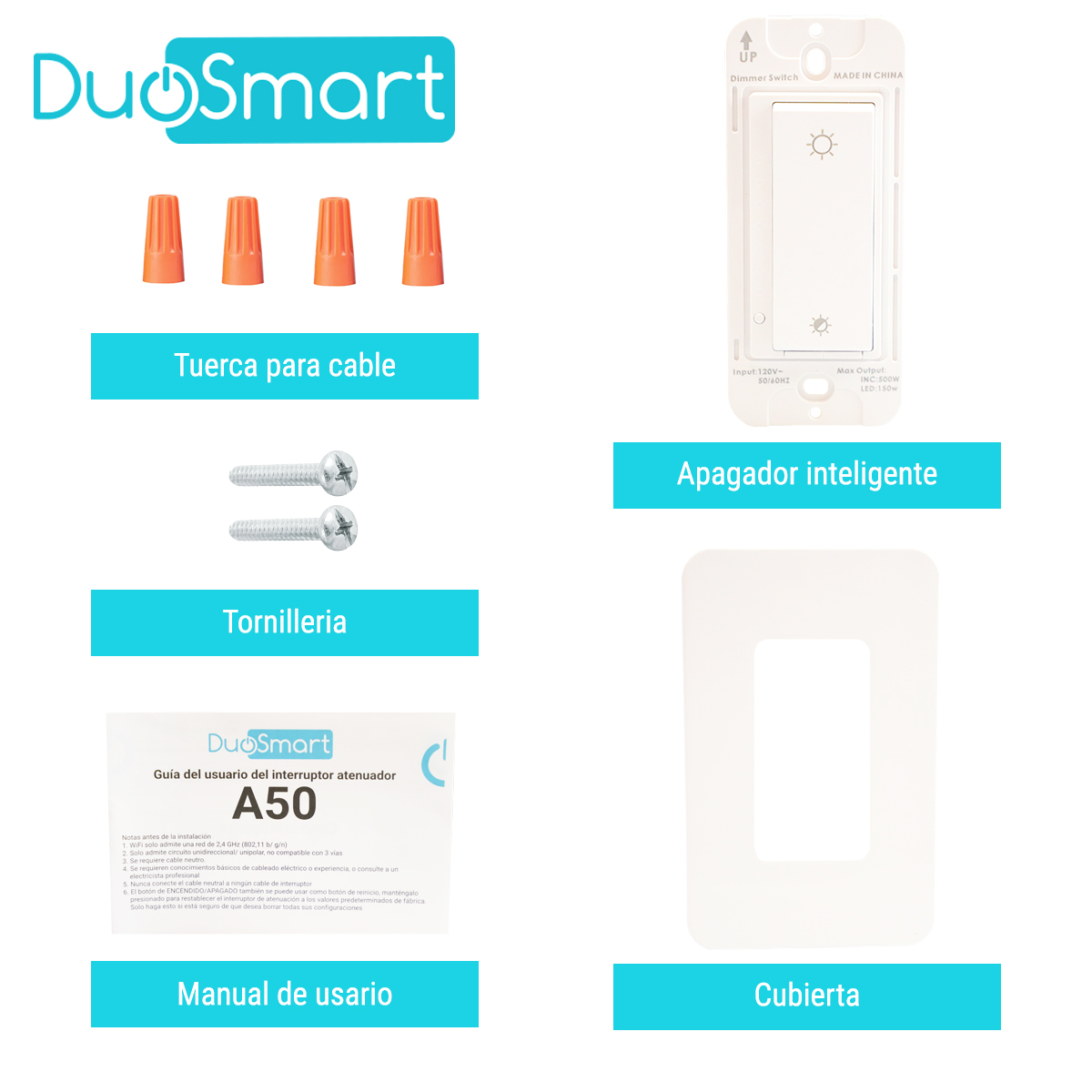Switch apagador Apagador inteligente con control de intensidad Duosmart A50 Controla tu luminaria dimeable gracias al control por fase de DUOSMART modelo A50 que te permite tener el control de la intensidad de iluminación desde cualquier parte gracias a su conexión Wifi 2.4GHZSi estás leyendo, haciendo ejercicio he incluso si tus hijos duermen puedes controlar la iluminación de cada habitación desde tu teléfono inteligente con la APP DUOSMART.Genera escenas y crea el ambiente perfecto para cada una de tus actividades y con la iluminación adecuada para cada momento del día **requiere cable neutro, compatible con WIFI de 2.4GHz. Características Protección contra sobrecarga Control electrónico de iluninación máxima y minima Temporizadores programables Compatible con escenas de automatización Encendido y apagado con control tipo touch Control completo con app Duosmart Especificaciones Voltaje de operación 100 - 250 VCA Potencia de carga de hasta 500 watts en lámparas incandescentes Potencia de carda de hasta 150 watts en focos y lámparas tipo led (deben ser dimmeables para poder regular la intensidad) Requiere cable neutro Frecuencia de operación (red) 2.4 GHz Estandar inalámbrico IEE802.11 b/g/n Temperatura de operación -20° C - 75°C Medidas 125 x 80 x 420 mm
