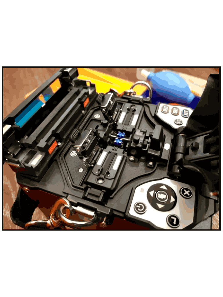 Equipo profesional que une dos fibras ópticas mediante un arco eléctrico, logrando un empalme preciso y confiable.