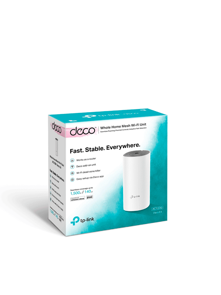 Deco E4 es la forma más sencilla de garantizar una fuerte señal de Wi-Fi en cada rincón de su hogar. Las conexiones inalámbricas y el backhaul de Ethernet opcional funcionan en conjunto para vincular unidades Deco, proporcionando aún más rápido velocidades de red y una cobertura realmente fluida. ¿Desea más cobertura? Simplemente agregue otro Deco.