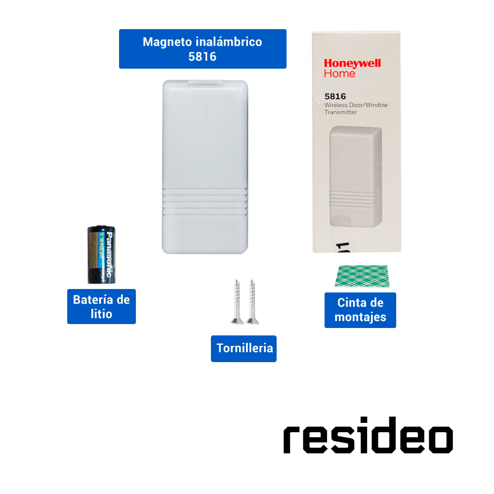 TRANSMISOR INALAMBRICO RESIDEO 5816 MATERIAL PLÁSTICO/ COLOR BLANCO/ ALCANCE DE UN MILLA / DISEÑO ELEGANTE/ INTERRUPTOR DE LENGÜETA NC/ SE PUEDE UTILIZAR COMO MAGNETO AGREGANDO EL IMAN 5899 / INLCUYE BATERIA