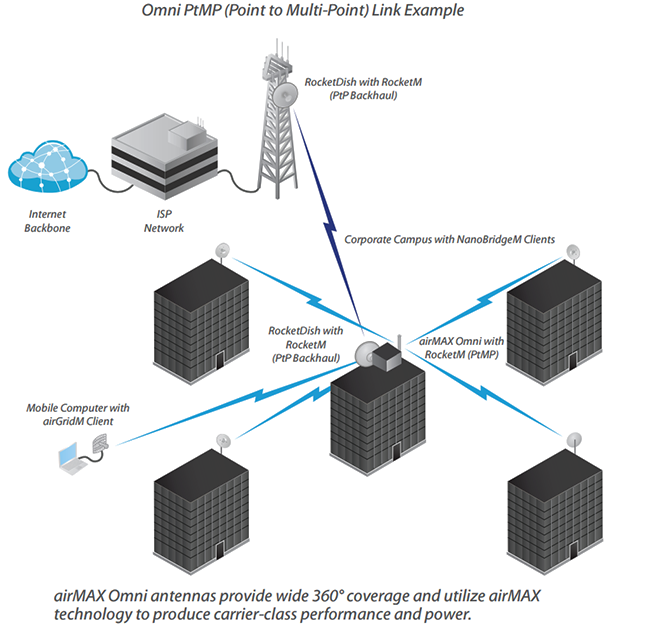 La serie de antenas airMAX Omni pueden ser utilizadas con un equipo Rocket BaseStation para así poder tener una cobertura de 360° para sus enlaces de punto a punto (PtP) y multipunto (PtMP).