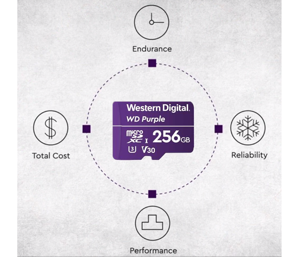 Las tarjetas microSD WD Purple están diseñadas para un funcionamiento continuo 24/7, y tienen la alta resistencia necesaria para aplicaciones de vigilancia intensivas en escritura. Una tarjeta microSD WD Purple de 256 GB puede grabar hasta 256 TB de video durante la vida útil de la tarjeta. Reemplazar el almacenamiento en cámaras de vigilancia inaccesibles puede ser costoso, por lo que usar una tarjeta Purple ahorrará un costo significativo en comparación con el uso de múltiples tarjetas enfocadas en el rendimiento. Las tarjetas microSD WD Purple también están diseñadas para soportar cambios de temperatura, alta humedad y alta vibración, y son ideales para entornos hostiles.